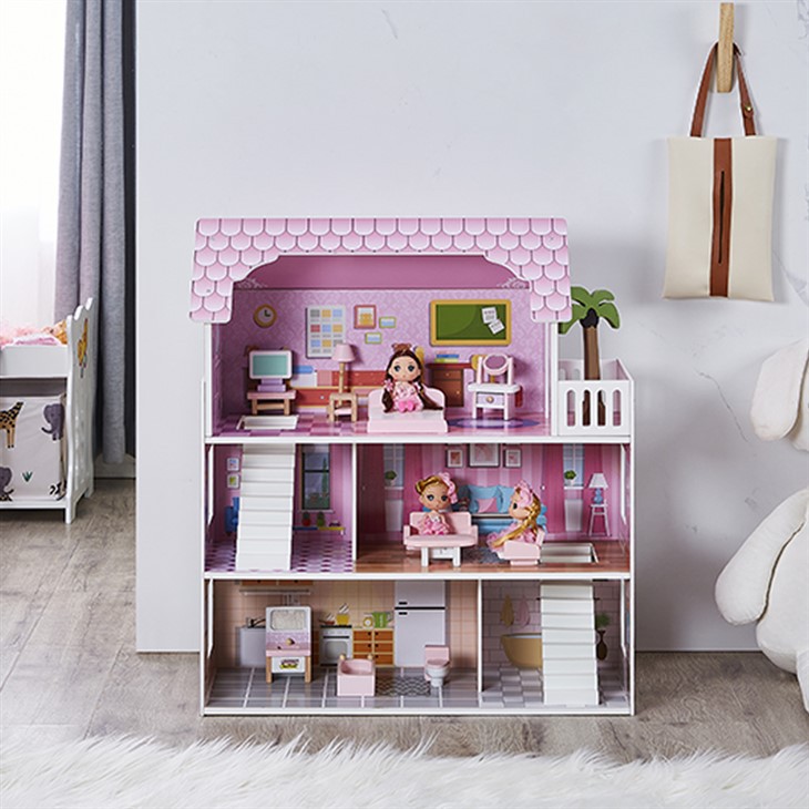 Tämä puinen vaaleanpunainen tarra-nukketalo koostuu yleensä useista huoneista, mukaan lukien makuuhuoneet, olohuoneet, keittiöt, kylpyhuoneet ja niin edelleen.