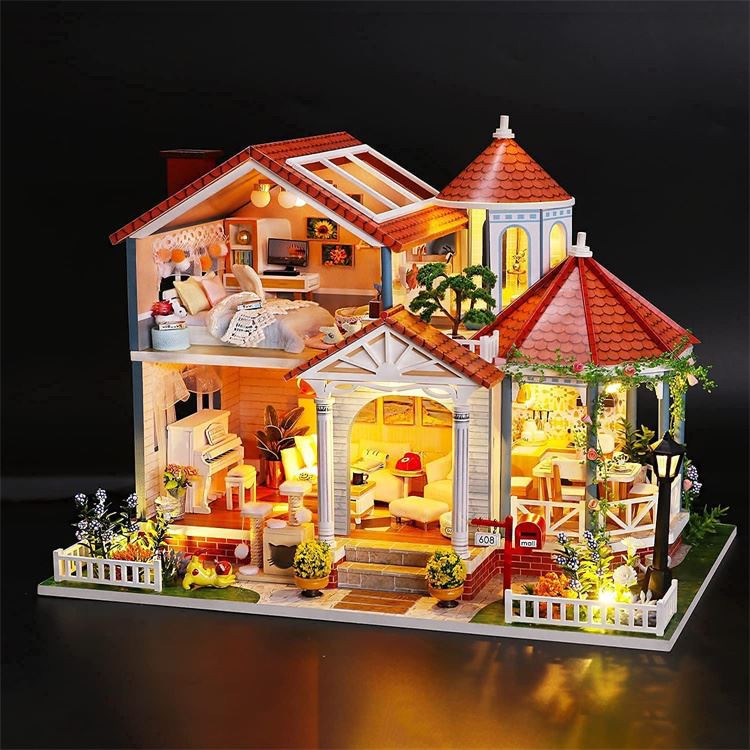 Tämä itse tehty minihuonekalujen puinen nukketalo on nerokas suunnittelu, erinomainen laatu, tarkka leikkaustarvikkeiden ja sopii täydellisesti. Siinä on LED-valoja, kasveja, maalauksia, koristeita, huonekaluja jne., jotka ovat todentuntuisia. Lisäksi nämä huonekalut on valmistettu turvallisista, myrkyttömistä ja korkealaatuisista materiaaleista, jotka ovat melkein samanlaisia kuin todelliset huoneet, mukaan lukien puu, muovi, kangas ja paperi. Käytä kaksi tuntia sen kokoamiseen joka päivä ja pidä siitä kiinni. Se ei vain voi auttaa lapsiasi kehittämään hyviä tapoja, vaan myös luomaan yllätyslelukodin.